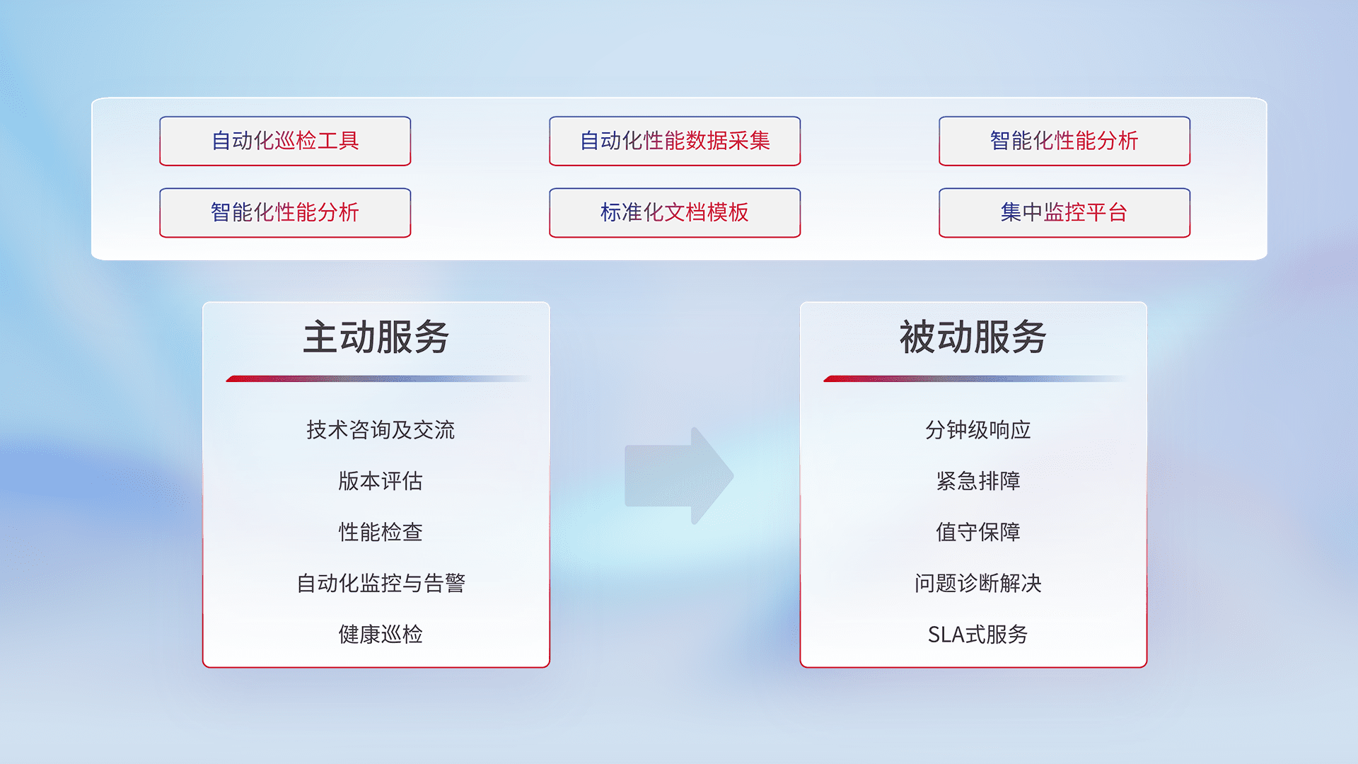 智能化工具和标准化文档,,保障服务质量,,,提供主动服务(包含技术咨询、、、、版本评估、、性能检查、、、自动化监控与告警、、健康巡检)和被动服务包含(分钟级响应、、、紧急排障、、、值守保障、、、问题诊断解决、、、SLA服务)。。。